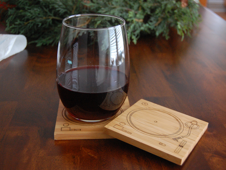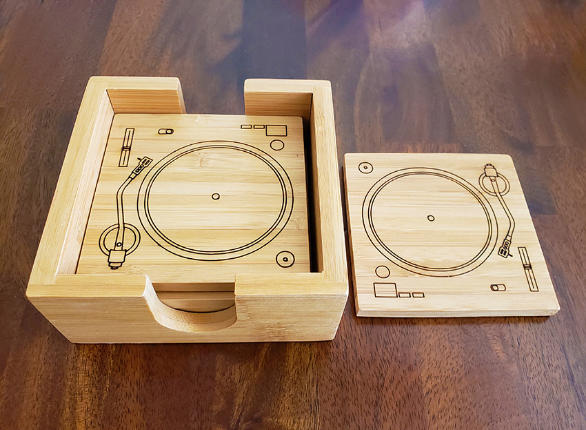 Set Of 4 Turntable Coasters W/ Coaster Holder. Laser Cut And Made From Bamboo. Created For A Maker And A Gentleman, 2018.